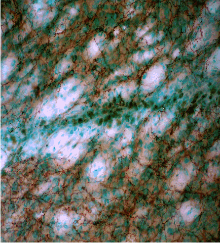 In another set of experiments, the Company's scientists injected a drug into a rat's brain, which depletes those neurons producing dopamine. The loss of dopamine-producing neurons experimentally produces Parkinson's disease. In the below photomicrograph, injected naive BLSCs had differentiated into dopamine-producing neurons (brown staining cells) in the area of the brain that had previously been depleted by the drug. These results give promise for using the Company's stem cells for treating patients with Parkinson's disease. This procedure will also be used to remodel the damaged brain tissue in those patients who had just suffered a stroke.