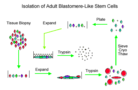 After extended exposure to dexamethasone, adult-derived blastomere-like stem cells differentiated into more than 50 discrete cell types. The induced cell types exhibited characteristic morphological and phenotypic expression markers for spermatogonia, pluripotent epiblastic-like stem cells, and germ layer lineage stem cells derived from the mesoderm, ectoderm, and endoderm with their respective differentiated cell types. This induced unidirectional lineage-commitment process necessitates the use of either general induction agents or those that cause the cell to differentiate into specific lineages shown in the below diagram.